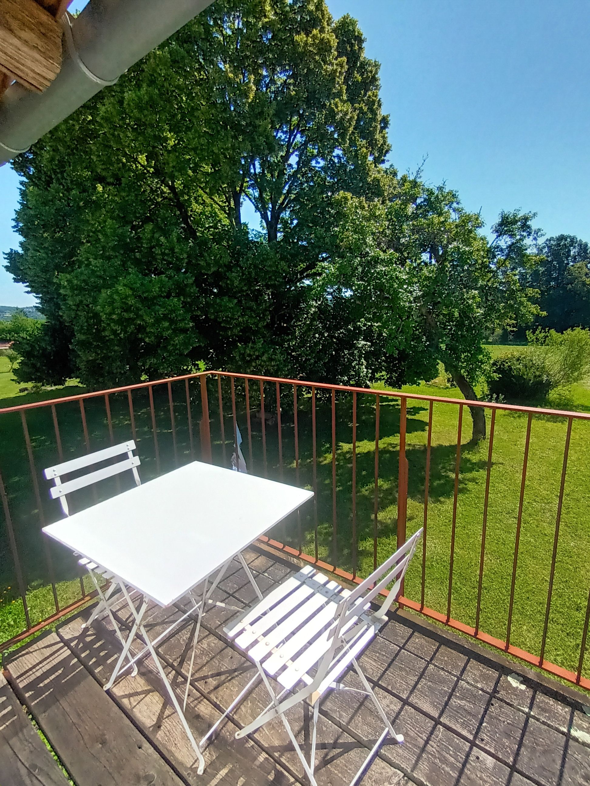 Patio doors leading onto a balcony overlooking the surrounding fields, with a small table and chairs